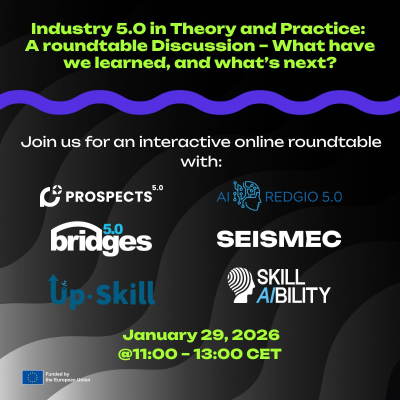 Join us for an interactive online roundtable, bringing together leading voices from the EU HORIZON projects AIREDGIO, BRIDGES 5.0, PROSPECTS 5.0, SEISMEC, SKILLAIBILITY, and UPSKILL to explore the evolving landscape of Industry 5.0.